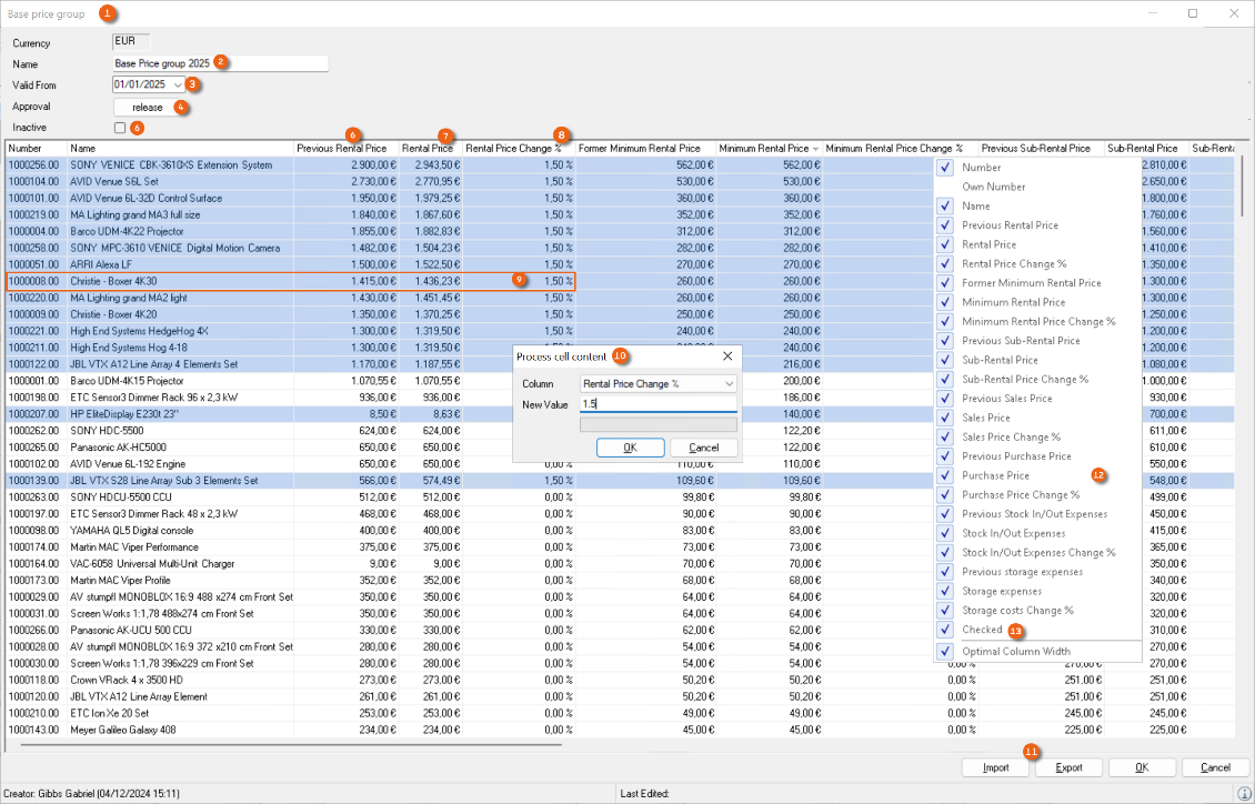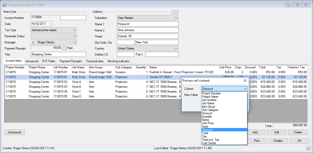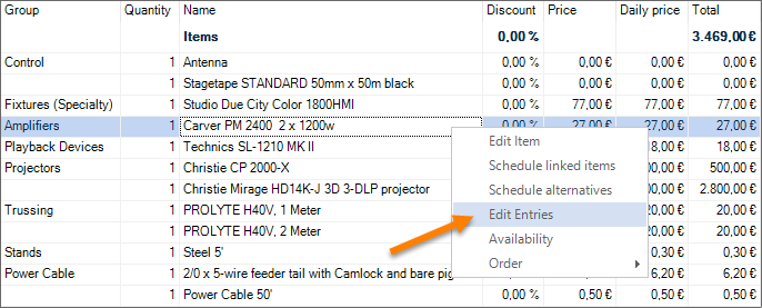 The Edit Multiple Entries feature can be used to edit multiple selected entries at the same time. The Edit Multiple Entries feature is available for the bill of items as well as for invoice item lists.