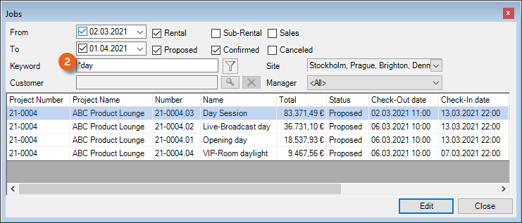 Example with *day. As easyjob additional places * at the end of your entry (*day*) internally, all jobs that contain the letters day will be listed.