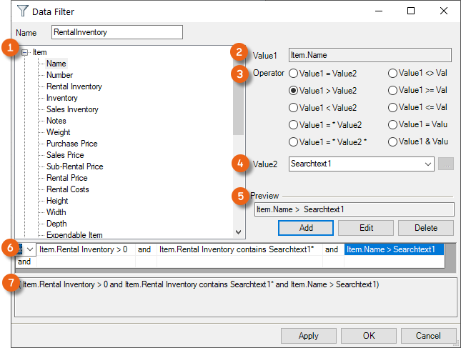 On the left side, you can see the variable list for Value 1. On the right side you can see the setting for the current formula. With operator, you can determine how you want to link Value 1 with Value 2. For Value 2 you can use a search field, a fixed value or a variable.