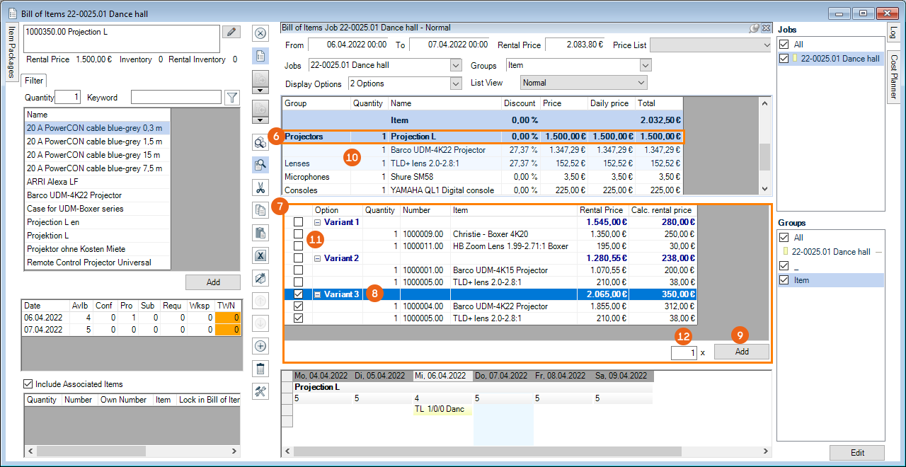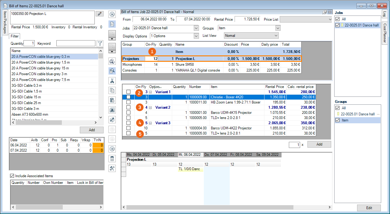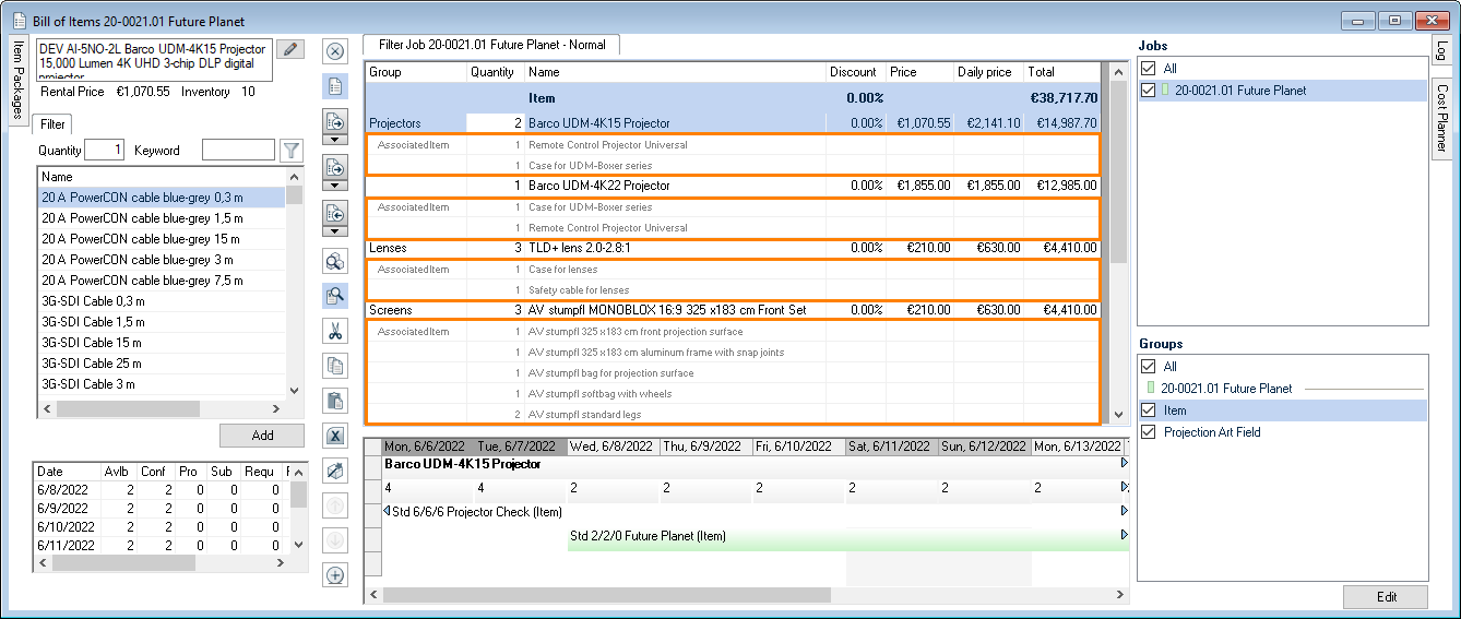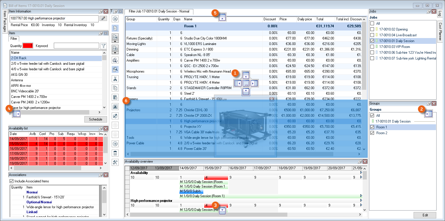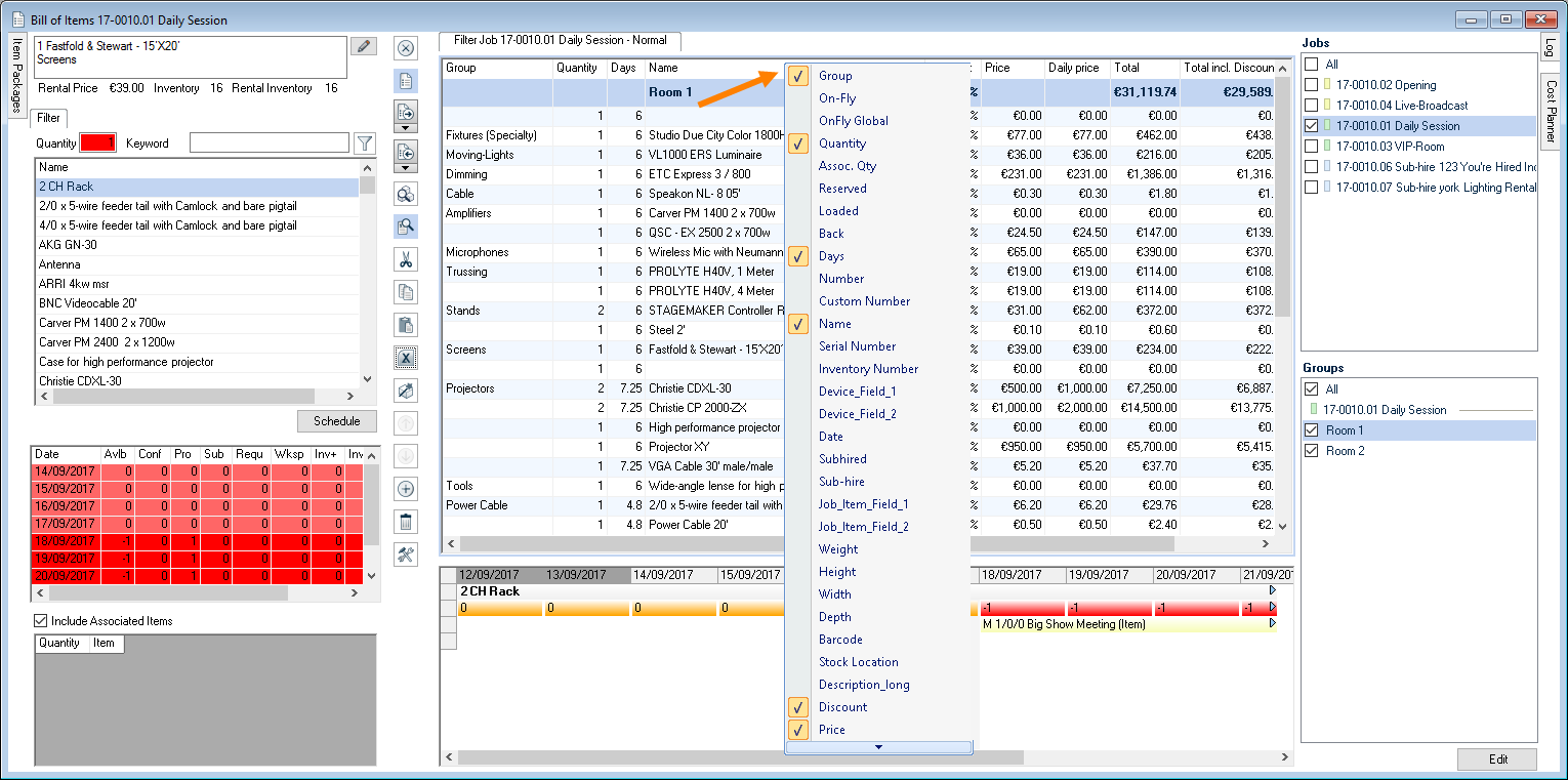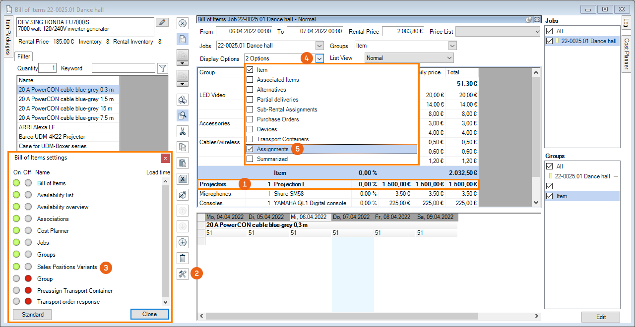 As is the case for the bill of items, various options are available for setting up the workspace. The layout and filter settings are stored for each user per workspace.