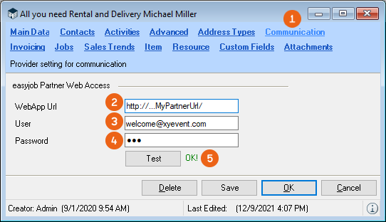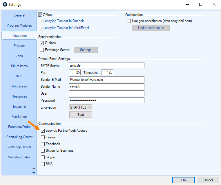 Distance filter![]() | The distance filter can be used to search for optimal staff in the area of the company address, the delivery address/venue or a manually selected address. In the program settings, activate the Geolocation area:7. easyjob Menu Tools Settings 8. Integration9. Click the Use Geo-Coordinates boxThe distance is calculated as a linear distance. |