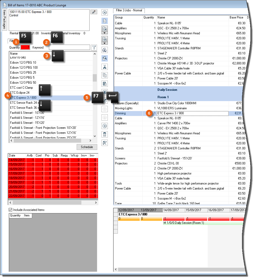 function key is assigned to Open bill of items.