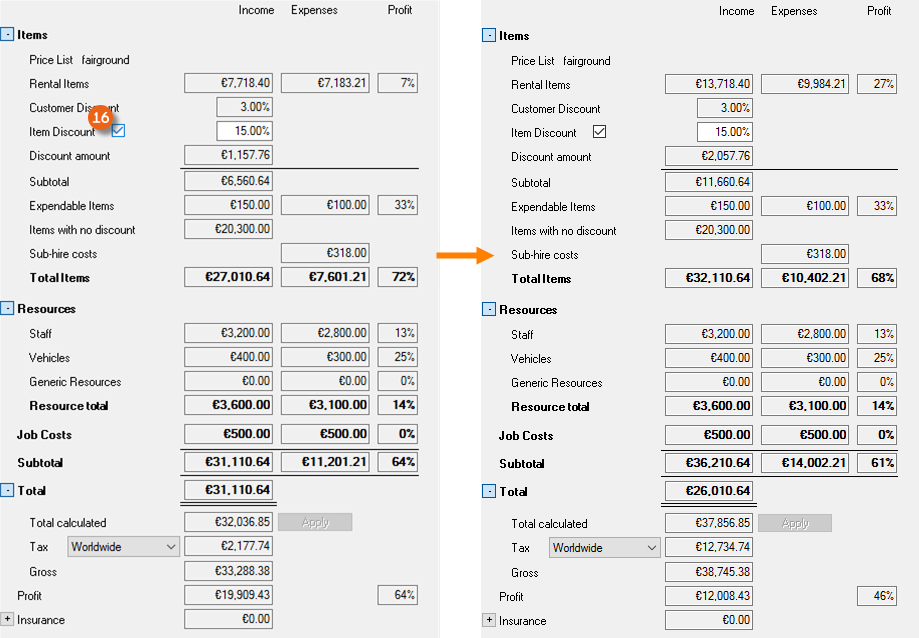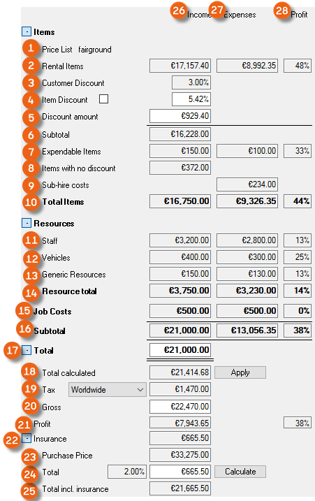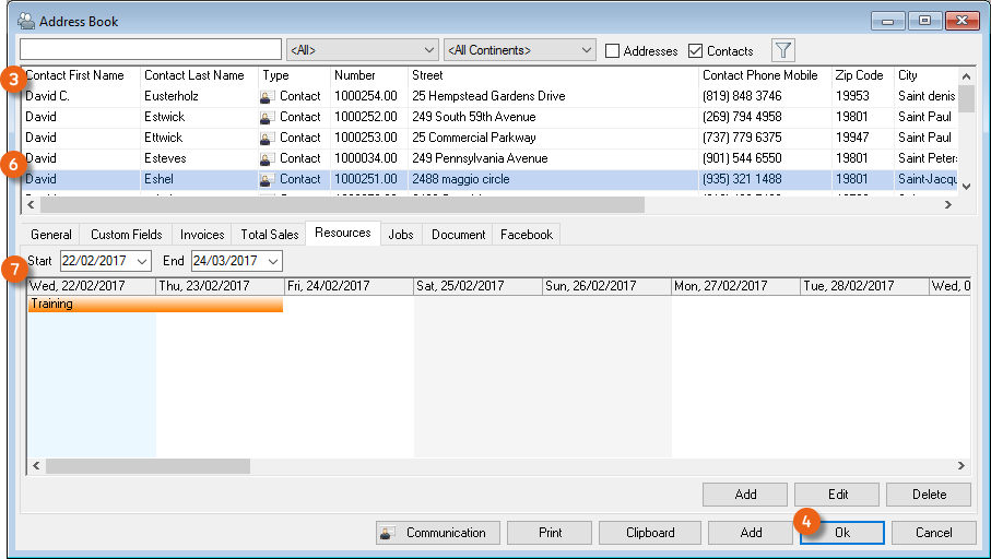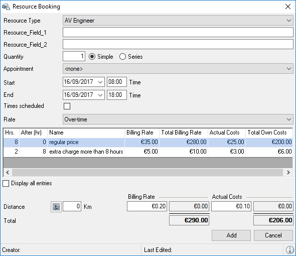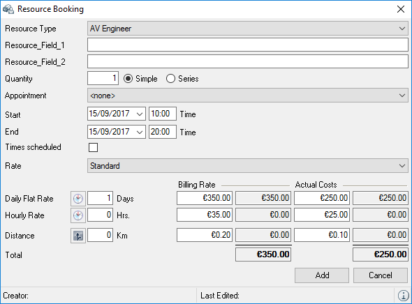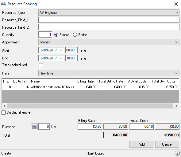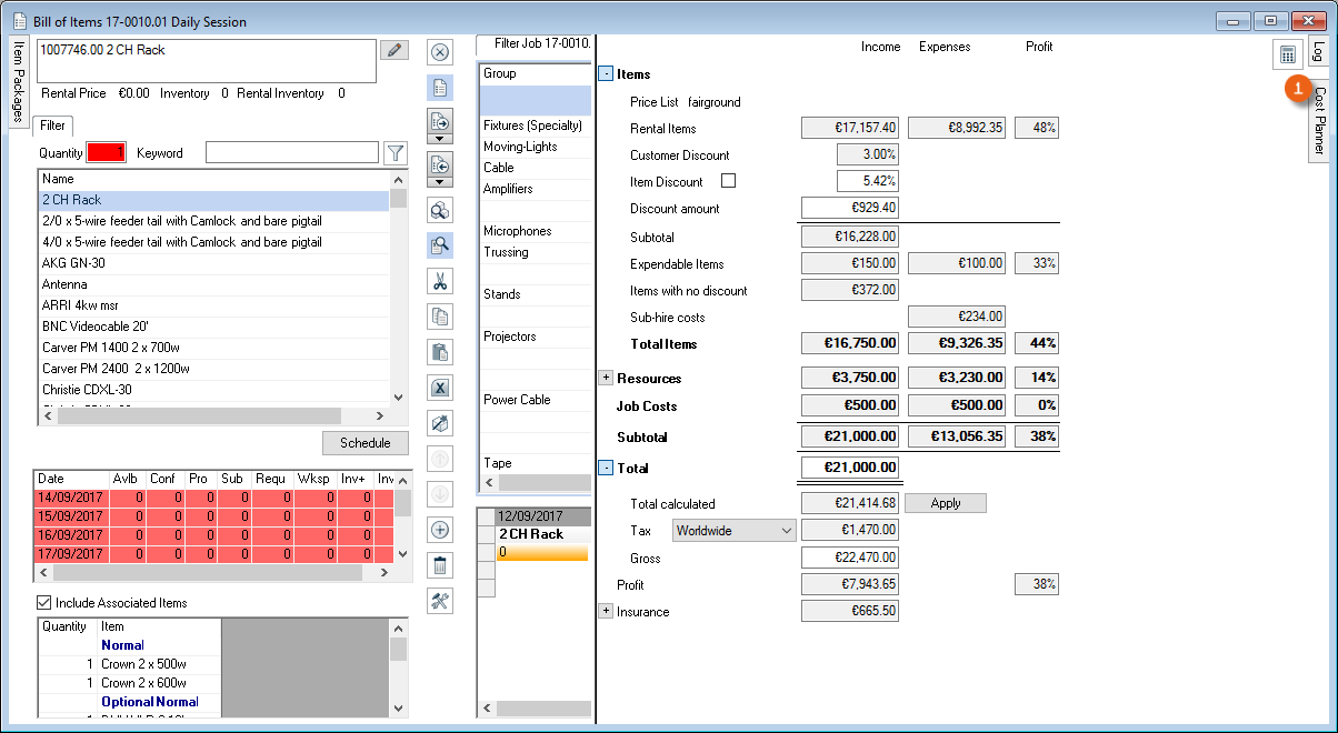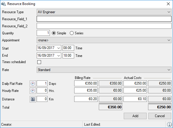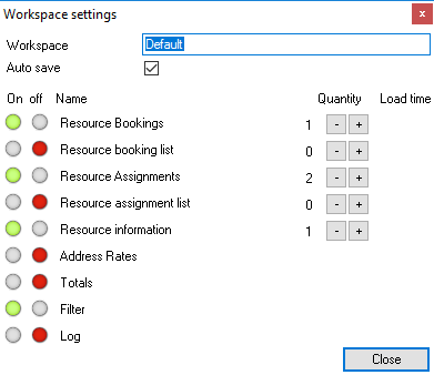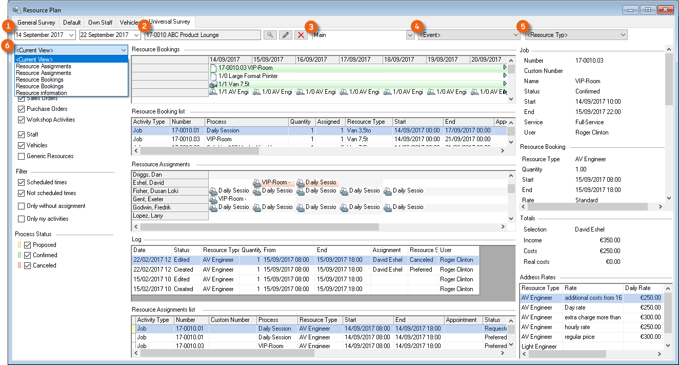 The Resource Information , Address Rates , Totals , Filter areas and the respective resource booking Log can be displayed and filtered if necessary and individually positioned.