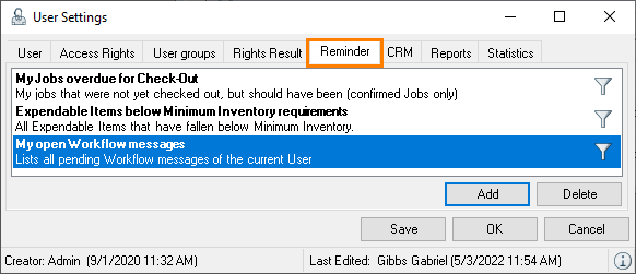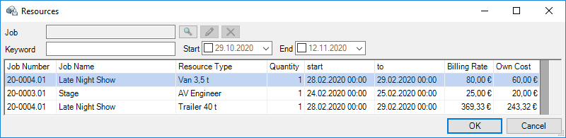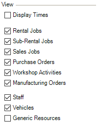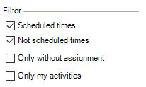 Filter![]() | The filter settings define which data should be filtered. When booking a resource in a job (by checking the Scheduled times box), you define if the entered times are provisional or if they are already final. You can also display the resources with this property here. By checking the Only my activities box, only the workshop activities are displayed for which the current user is the Job Manager. |