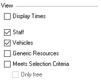 View![]() | Settings are carried out in the View area regarding what type of information should be displayed and if the data in the area should be filtered in other areas based on the selection. If you check the Meets selection criteria box, you will only see staff that meet the criteria for the selected resource type. By checking the Only display available box, the display will be limited to staff members who are available at the corresponding point in time. |