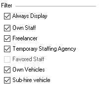 Filter![]() | The filter settings define which data should be filtered. With the boxes Always Display, Own staff, Freelancers and Temporary Staffing Agencies, you can also display the corresponding staff types. |