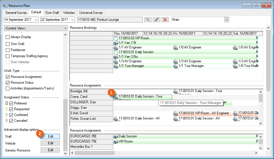 You can change the names for the resource booking, resource booking list, resource assignment and resource assignment list areas. This makes it possible to create the resource assignment are four times in a new workspace (e.g. overall view ) and give the areas different names (e.g. staff assignments , own vehicles , sub-rental vehicles and generic resources ). It will then be possible to select the resource assignment areas you created and by checking or unchecking the box, customize them to suit your needs.