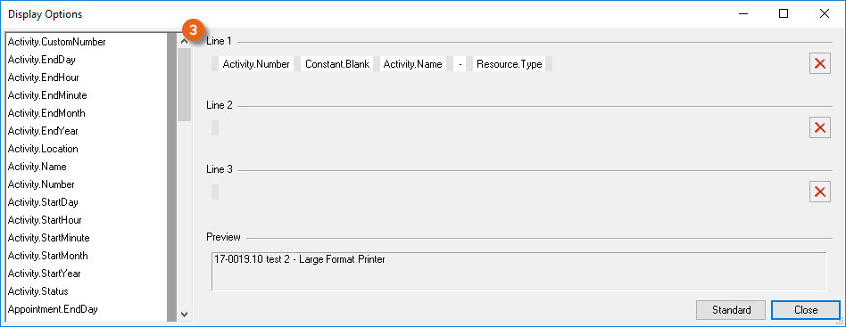 The content of the lines can be set individually per area This makes it possible to display the project in the case of a detailed staff view of staff and to display the resource type for a view of a selected project.