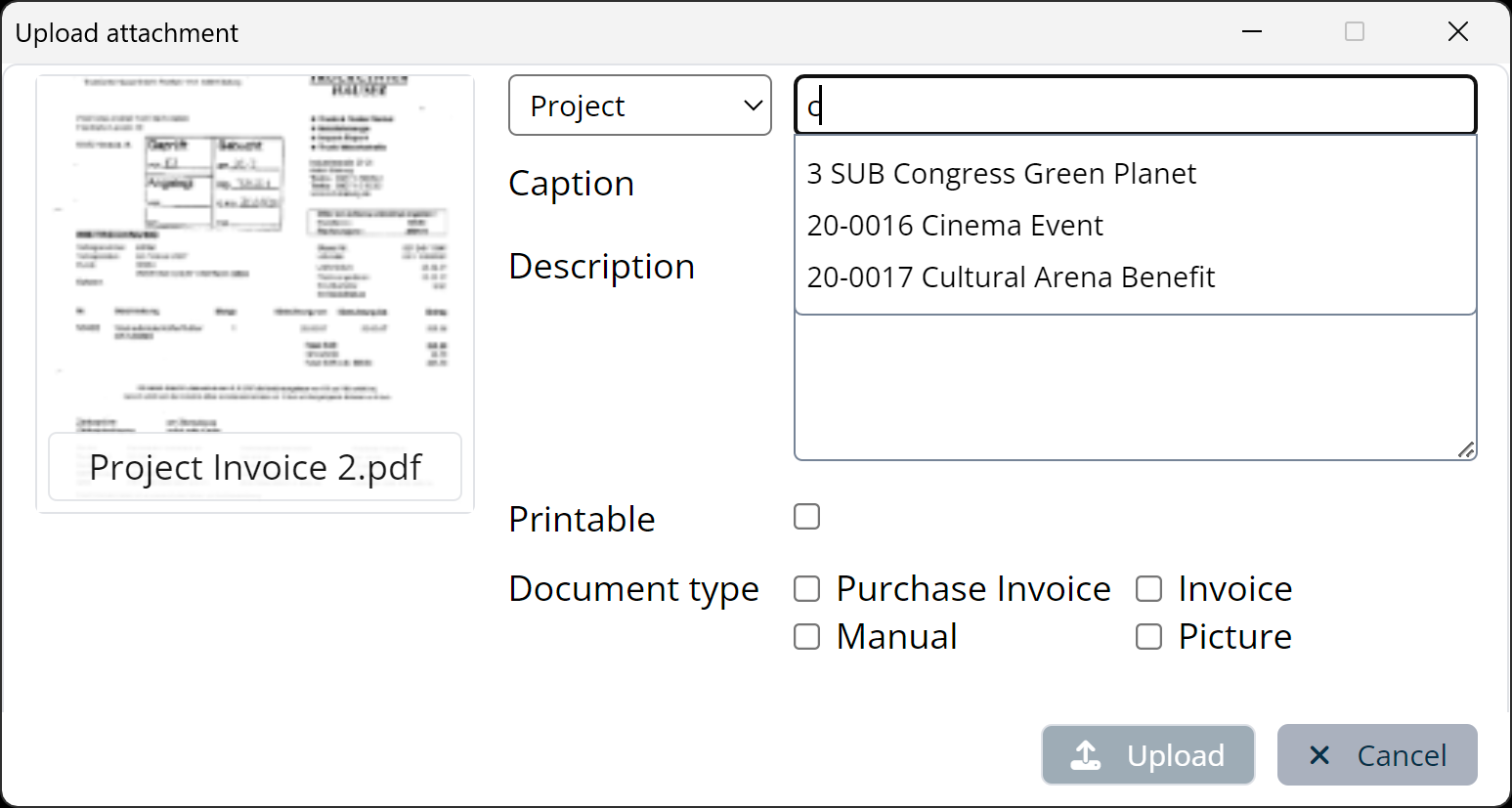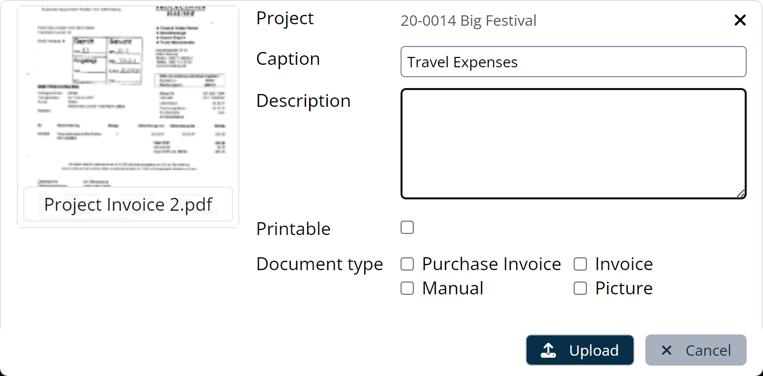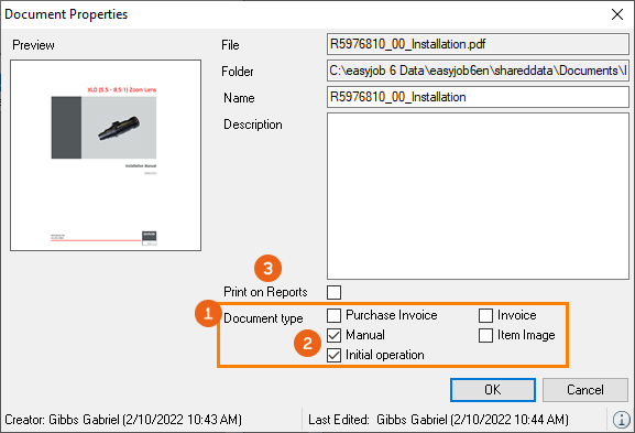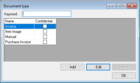 You can define an additional property for your attachments, the Document type . This defines the document type (e.e. manual, item image, purchase invoice, invoice, etc. ) of the current document. You can also classify the type of document in the master data as confidential. In this way, you can select in many easyjob areas if this document should be displayed or used there (in the case of confidential documents, only for users who have the right View confidential). You can also define here if the document should be Printable .