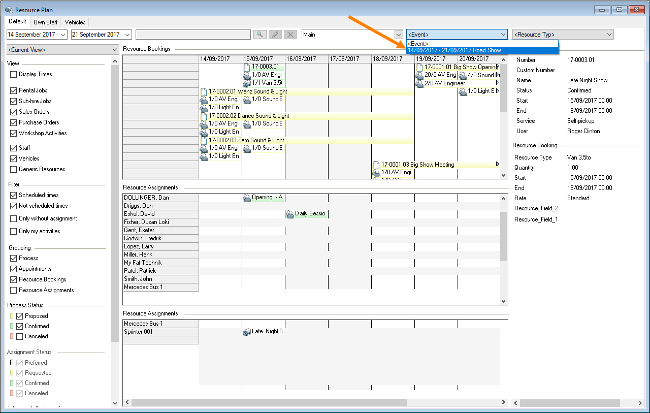 The resource type filter filters all displayed data according to a resource type. This makes the view clearer when you want to schedule a specific resource type.