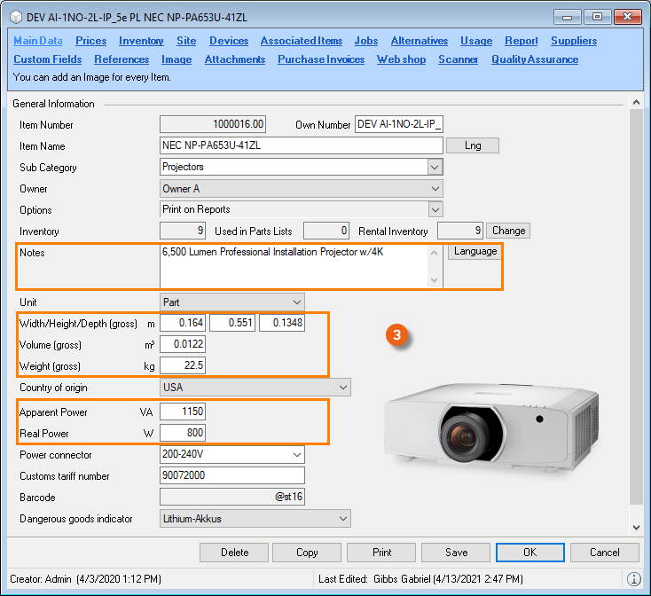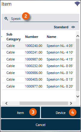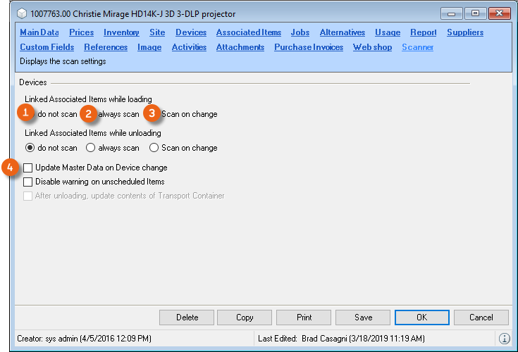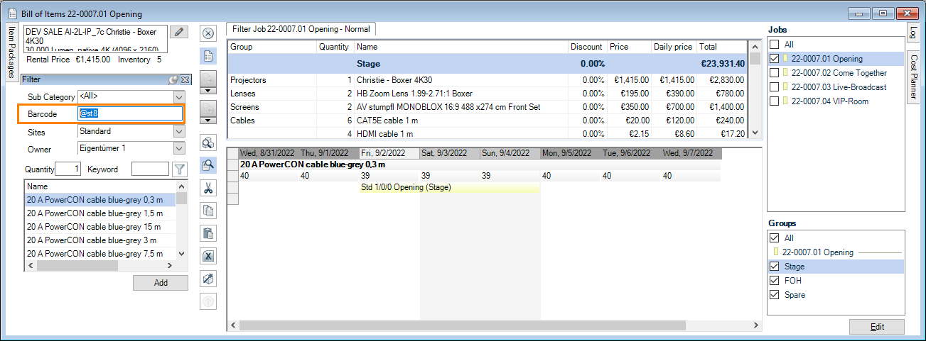 Barcodes can be processed in the easyjob Bill of Items using the barcode field. This requires the use of the barcode scanner, which emulates the entry of the information via a keyboard. We recommend this option only if necessary as visual contact with the computer is necessary in order to react to possible conflict messages.