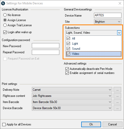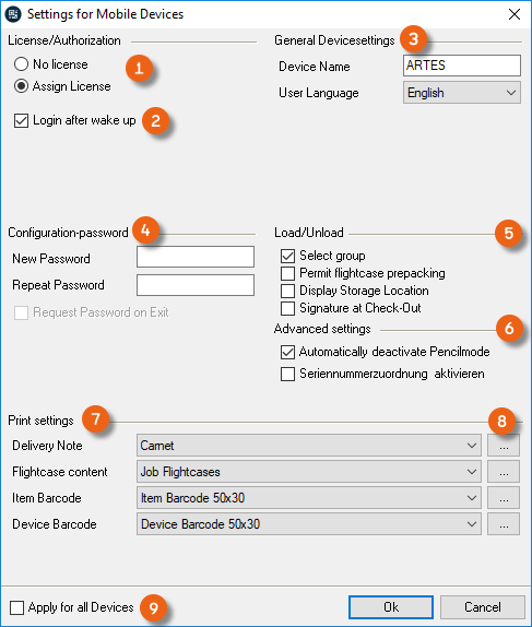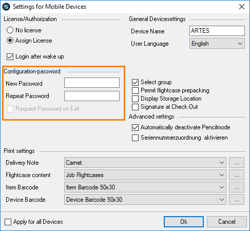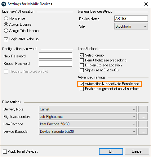 Here you can manage your individual settings for each scanner. You can assign a license to the respective device and define the login after wake-up . In the general device settings you can see the device names and can adapt the location of the scanner. You can protect the configuration with a password. See also Configuration password. .Presettings are possible for loading/unloading , pencil mode and serial number assignment . Furthermore, you can make a selection from various reports and their printer settings . To avoid having to configure every new device, you can apply settings to all devices .