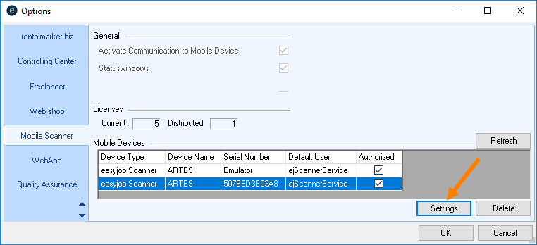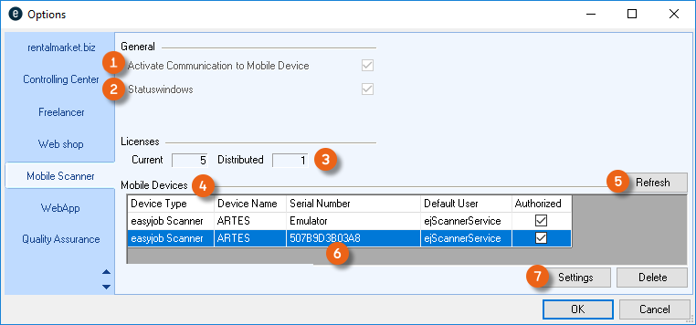 With the local easyjob settings activate communication between easyjob and your mobile devices . You can display the scanner status of your devices also upon program start . Administrator rights are required to activate these settings. See also Controlling mobile devices with easyjob. The overview shows how many licenses your have and how many of them are actually being used. Details can be found in Assigning the license .