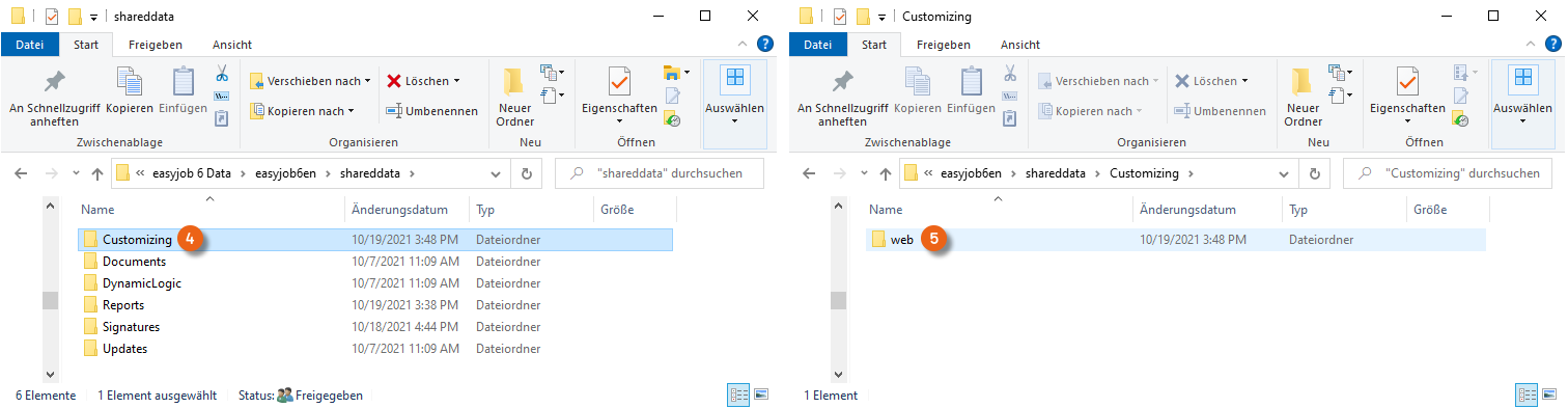 In this case, the easyjob Web access service offers the option to save the changed and/or new files in a predefined folder. The path to the folder is comprised of the path to the path to the global data directory and \Customizing\web\.