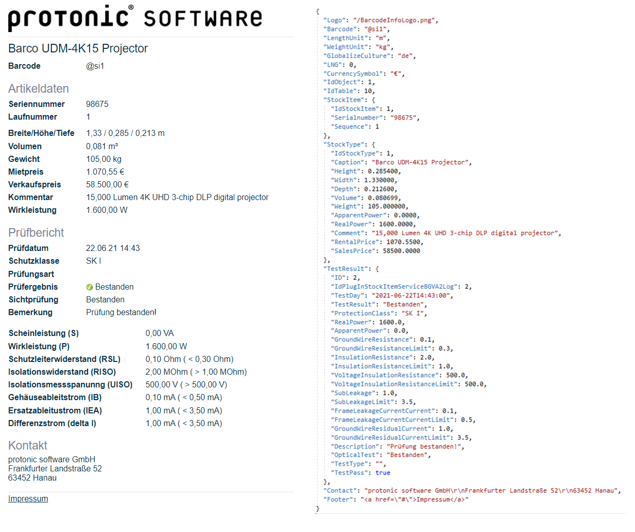 In the following example, the answer to the GET request is shown on the right side in JSON format, and the left side shows how the standard barcode information page visually displays the information and which field names are used for it..
