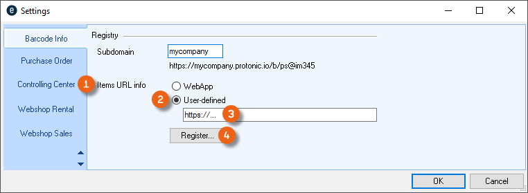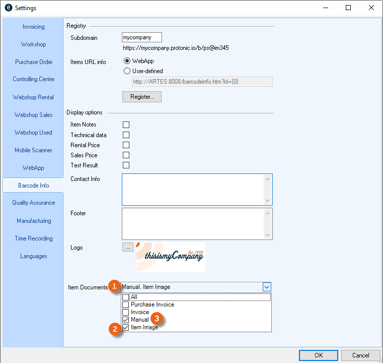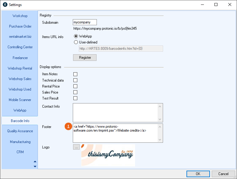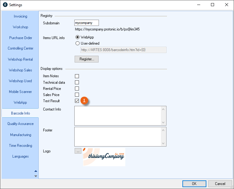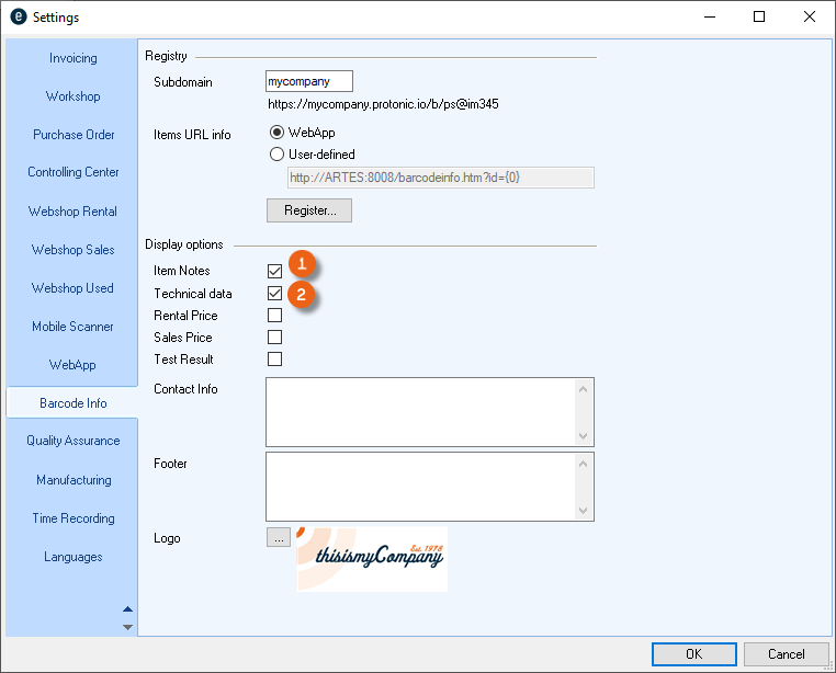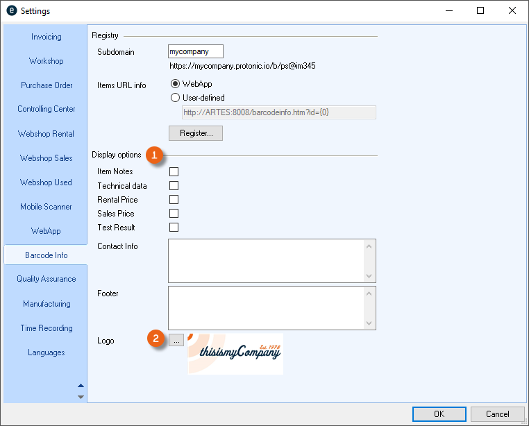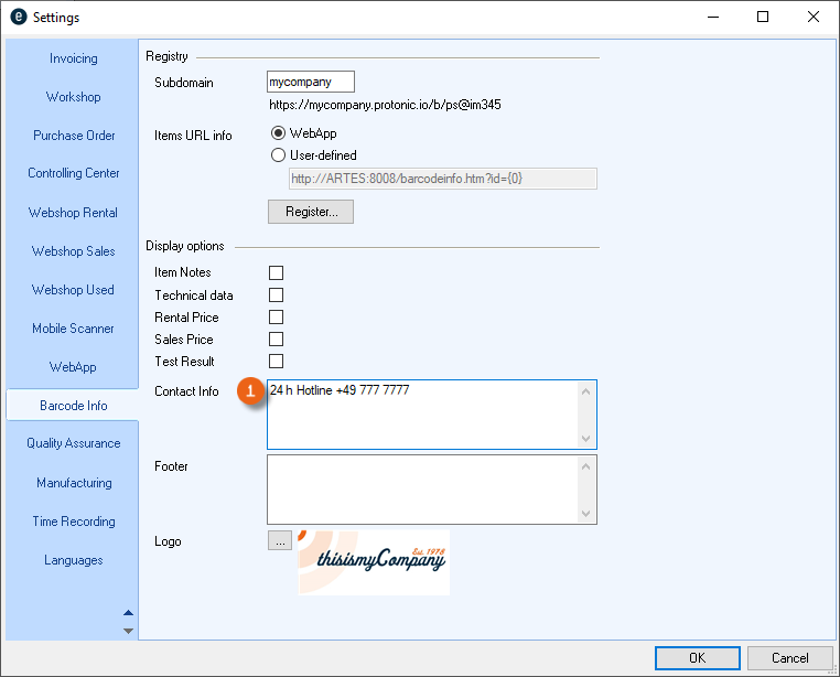 Go to the easyjob program settings to activate the Barcode Info function. A separate installation is not required. Add a subdomain (e.g. the name of your company ) to the URL. You can chose if you want to register Items URL info that can be accessed using the easyjob WebApp . You can use the display options already provided by protonic software, or you can create your own WebApp website. Alternatively, you can create a user-defined website and save your information there.