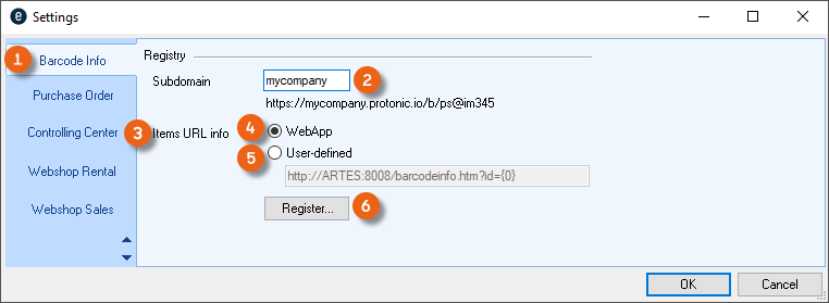 You can find information about the settings and use of Barcode Info about the Items URL Info of the WebApp website and about how to create a user-defined WebApp website on the following pages. Refer to chapter Creating your own Items URL info website . for information on what you must observe when you want to use a user-defined Items URL Info.