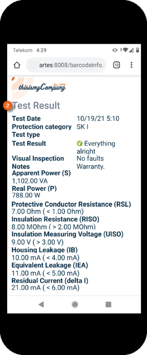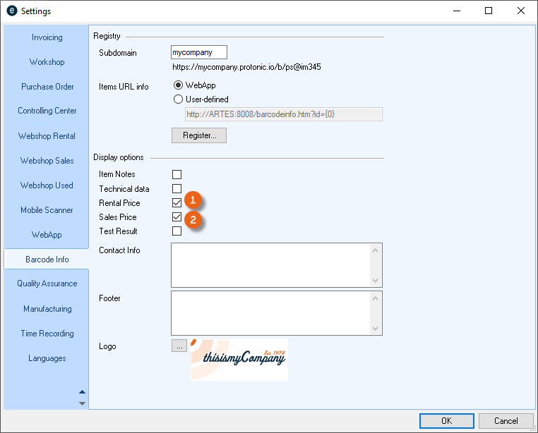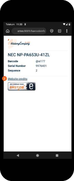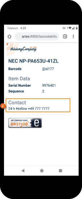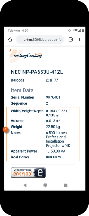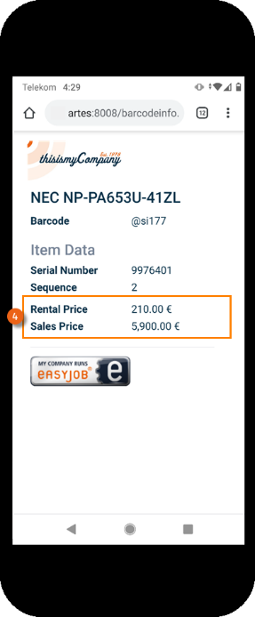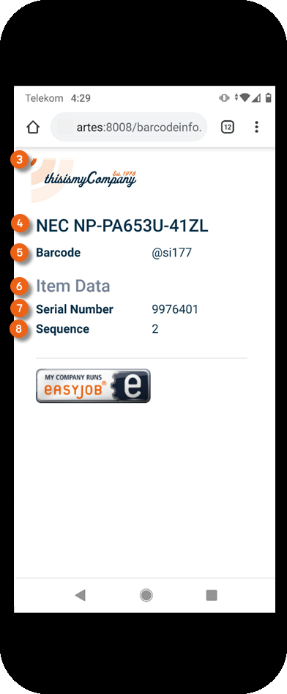 There are various display options in the easyjob settings for Barcode Info. You can have your logo displayed on the Barcode Info page .