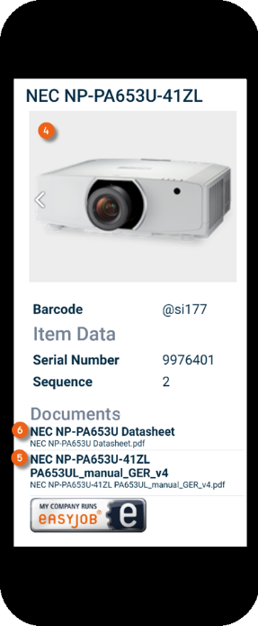 With the Item Documents option, you can provide additional information on the barcode info page. You can define the type of document to be displayed. If you select Item Image , all documents will be displayed that are an Item image . Documents that are a Manual (manuals, data sheets or operating instructions) will be displayed as a link to the PDF document . See also easyjob 6 manual document type.