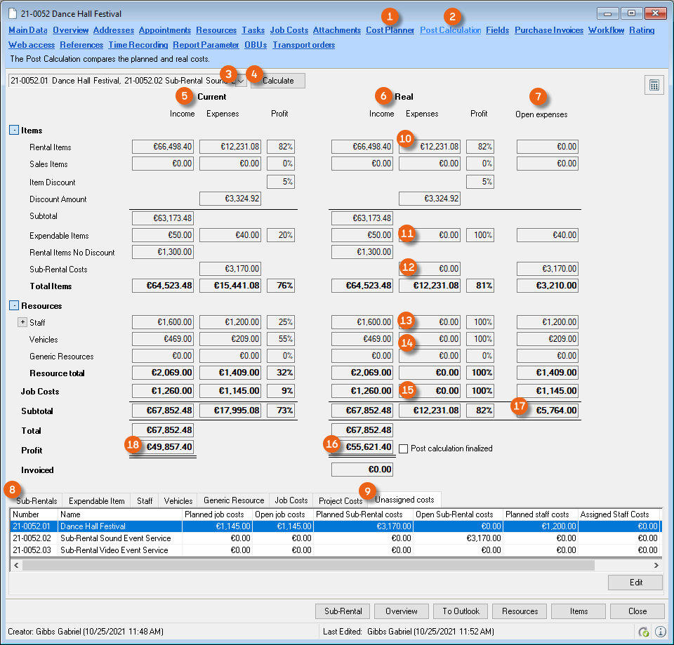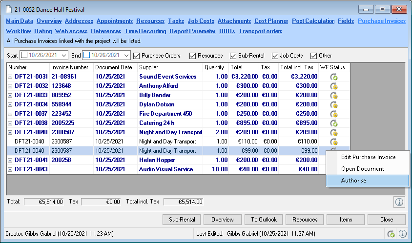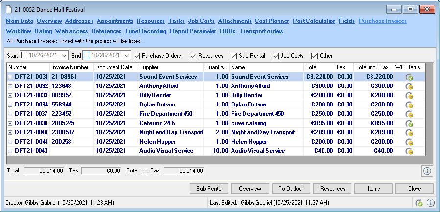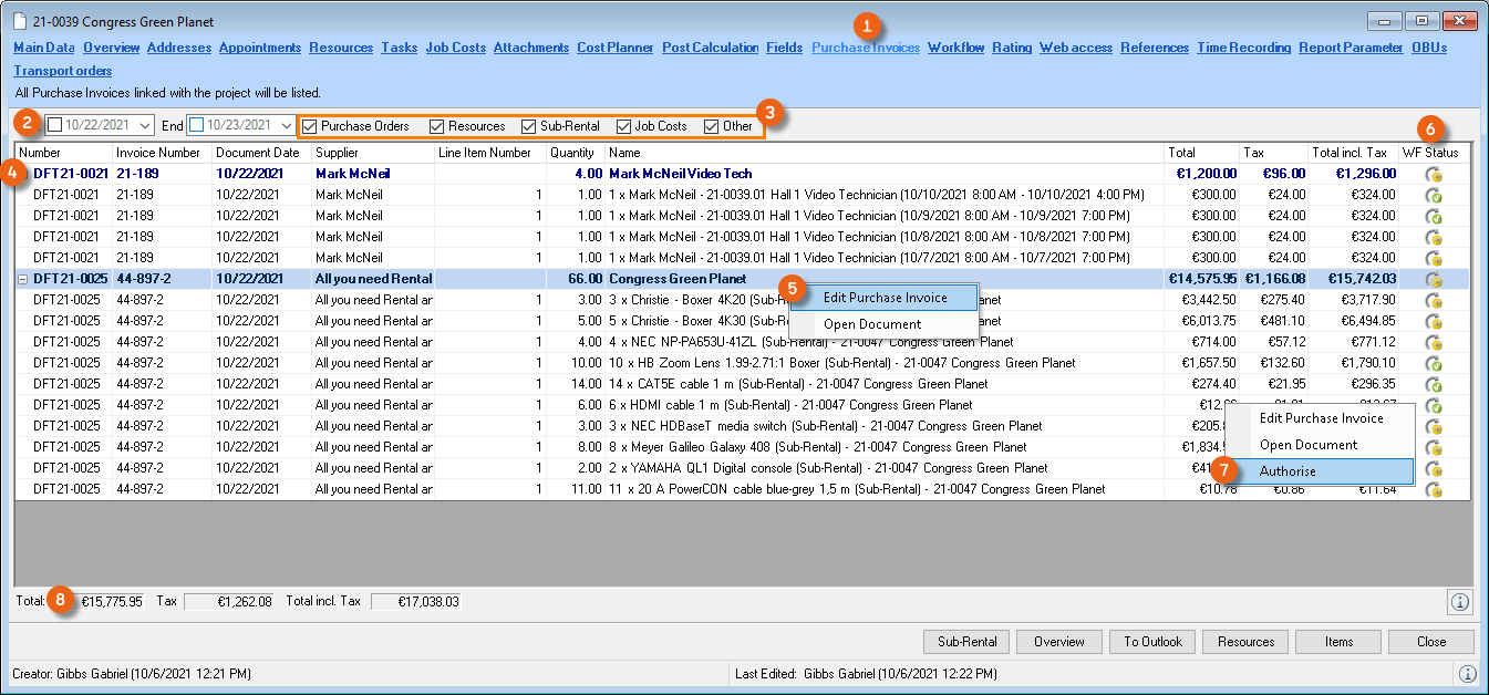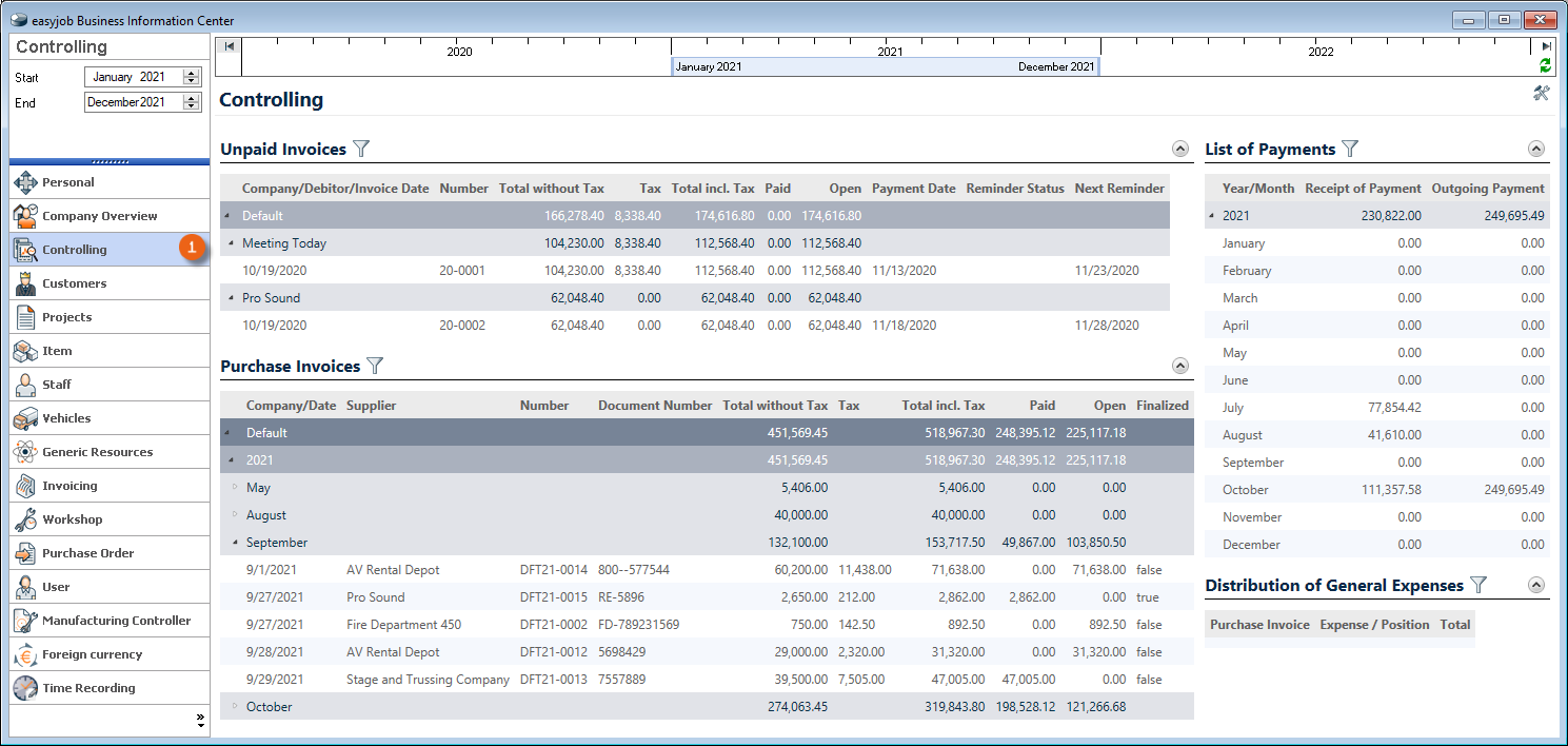The Controlling Center consists of various parts. The heart of the Controlling Center is purchase invoice management. With purchase invoice management, all incoming invoices are processed and assigned to the various areas (project costs, sub-hires, workshop activities, purchase orders, etc.).