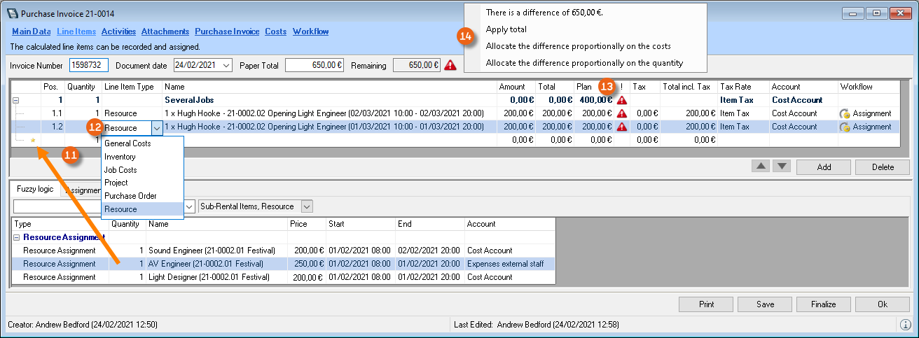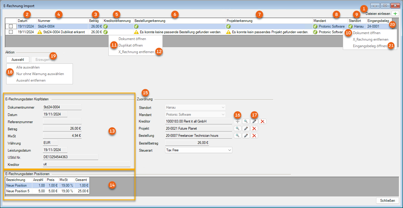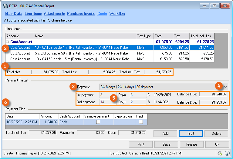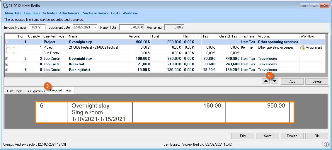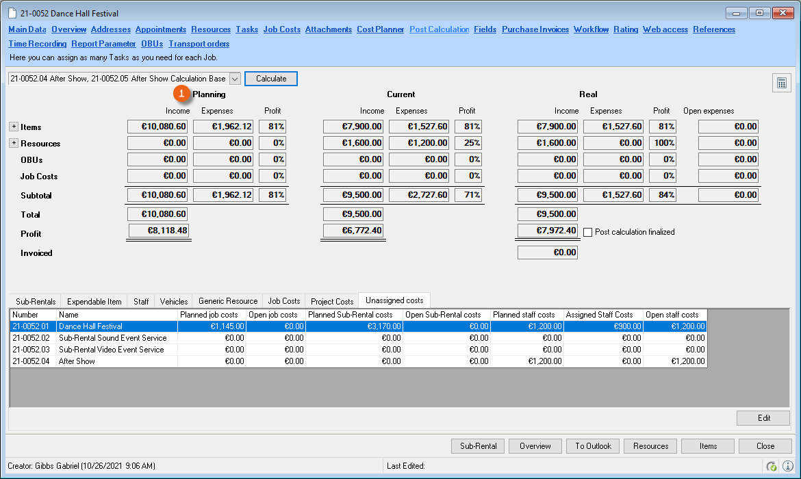 The Controlling Center consists of various parts. The heart of the Controlling Center is purchase invoice management. With purchase invoice management, all incoming invoices are processed and assigned to the various areas (project costs, sub-hires, workshop activities, purchase orders, etc.).