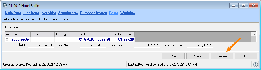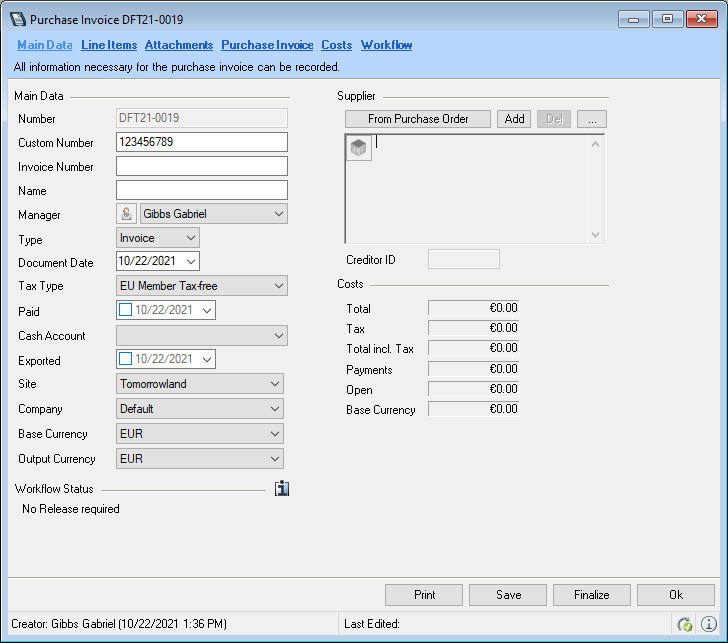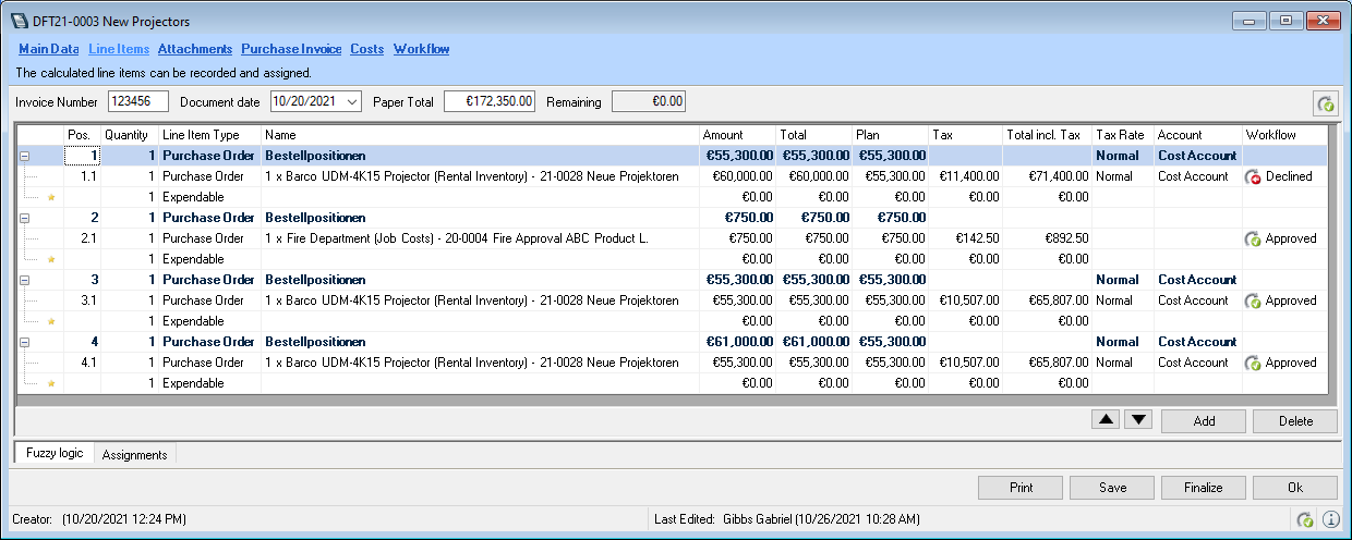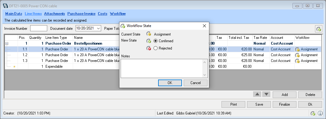 The Workflow Engine module provides options for an expanded release process, e.g. that has multiple release levels, automatic release when the invoice total is equal to the purchase order total, or to change the release managers. For more information, please contact our Support. Alternatively, you can activate one of the available release workflows More information can be found in easyjob Workflow Engine Purchase Invoice Line Item Authorization .