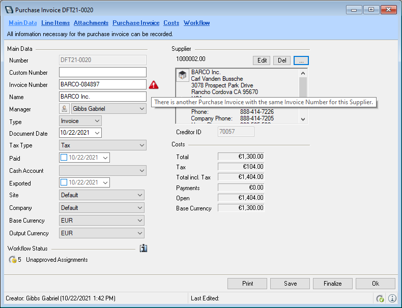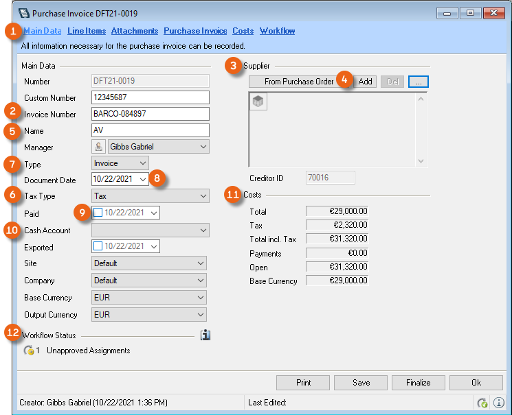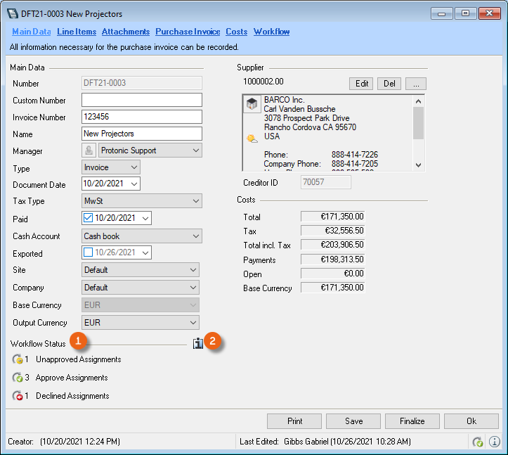 The main data of the purchase invoice displays an overview of the current workflow status of the assignments. You can view additional details by clicking the info icon .
