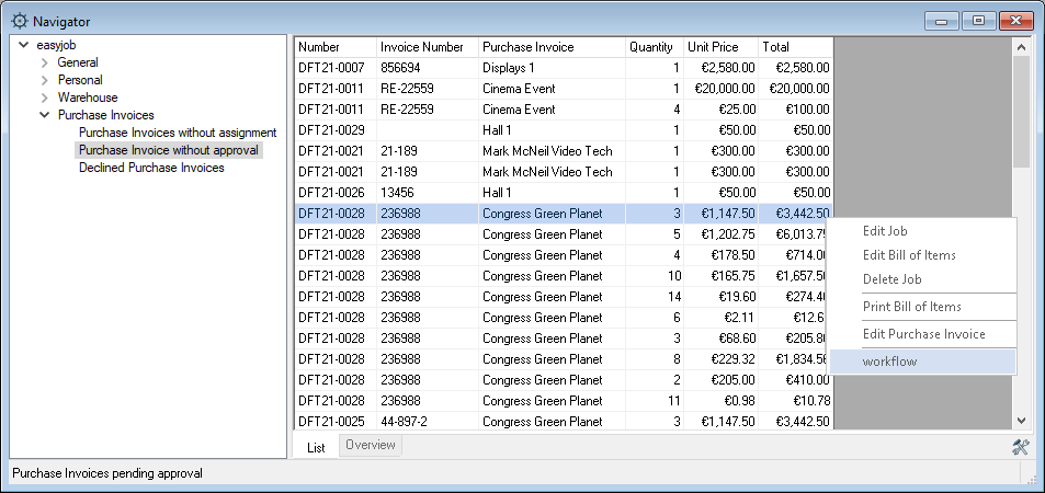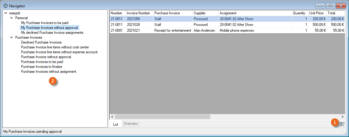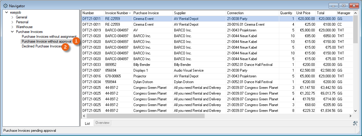 The Navigator and easyjob Today list all assignments that have not been authorized in the Purchase Invoices without authorization view. In addition, all purchase invoices with a rejected authorization are shown in the Rejected purchase invoices view.