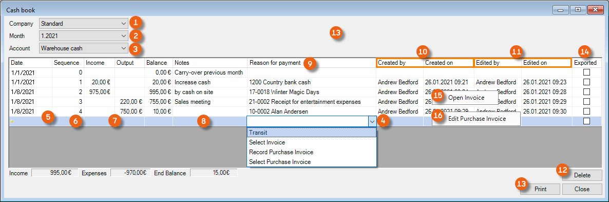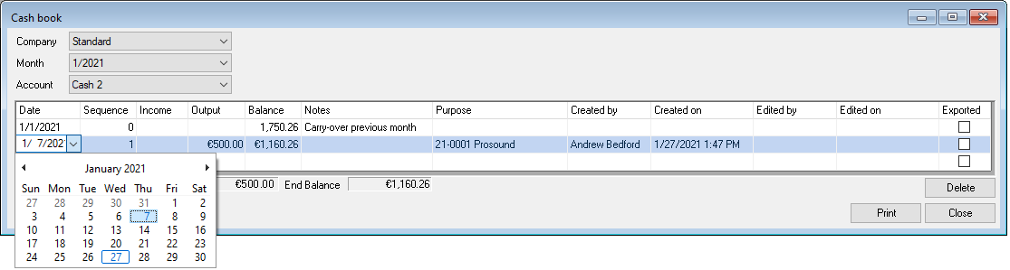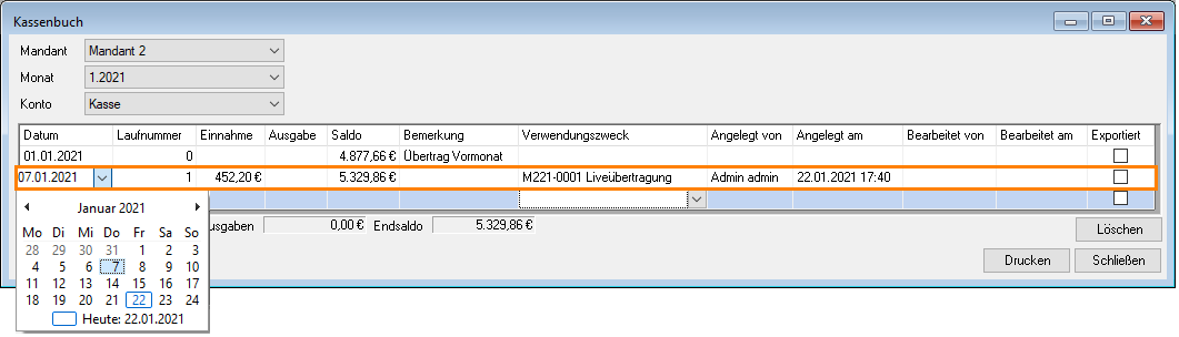 With the Cash book function, you can document your cash transactions according to standard accounting practices and link them with invoices and purchase invoices from easyjob. Select the Company , Month and corresponding Account Create a new entry by first defining the Reason for payment. You can select between Transit (from one cash account to another), Invoice and Purchase invoice . You can also create the purchase invoice directly from the cash book. The entry can only be made chronologically. The Date of the current entry may not precede the date of the previous entry. The lines are automatically assigned a Sequence number . Income/Output can be entered directly in the field. You can add a Comment . The Reason for payment automatically includes the dates of the assigned purchase order or activity. A log documents when and by whom the entry was created and edited . It is only possible to delete the last entry if the window is open, after it is closed the entry can no longer be changed. You can print directly from the view. If the entry was already exported , this is indicated by a checkmark. You can open the Invoice or the Purchase Invoice using the context menu. The payment receipt is set when posting.