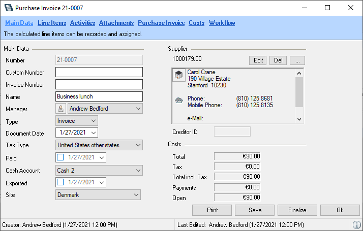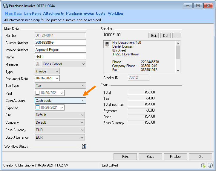 8. The cash book entry is made automatically and the purchase invoice is set to paid.