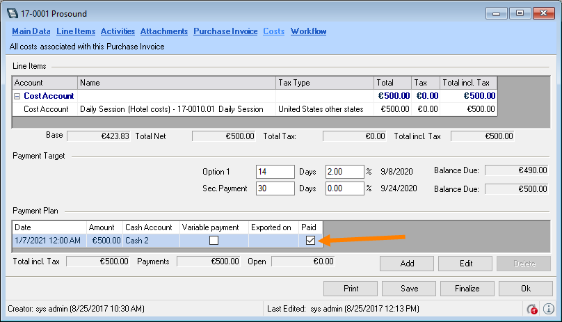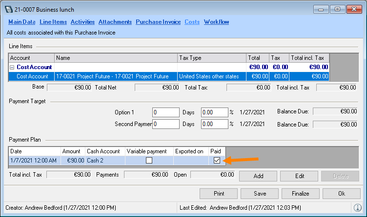 9. The purchase invoice is automatically set to paid