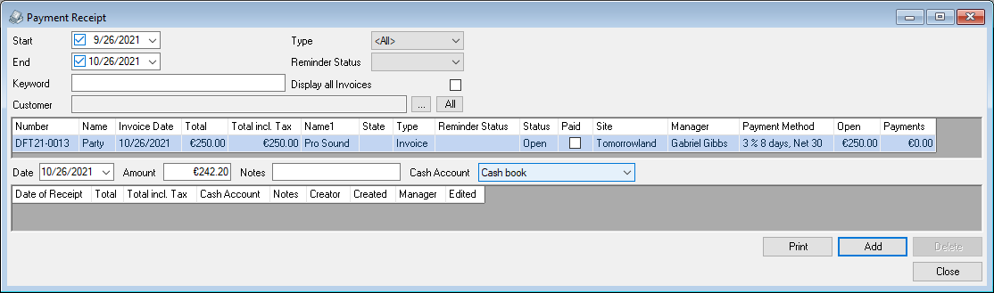 If you create an entry during from a Payment Receipt, from this moment you cannot make any earlier entries.. The corresponding invoice cannot be deleted.