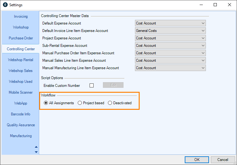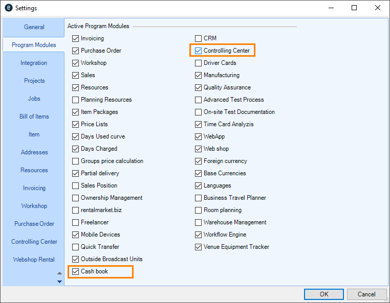 Go to the easyjob program settings to activate the easyjob Controlling Center module and the Cash Book The Cash Book function is coupled with the Controlling Center module A separate installation is not required.