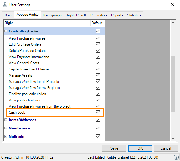 Assigning the user right for the cash book