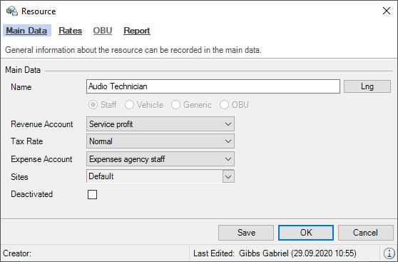 The corresponding expense account can be selected for each resource type. When assigning a purchase invoice from an external service provider, the selected expense account is used.