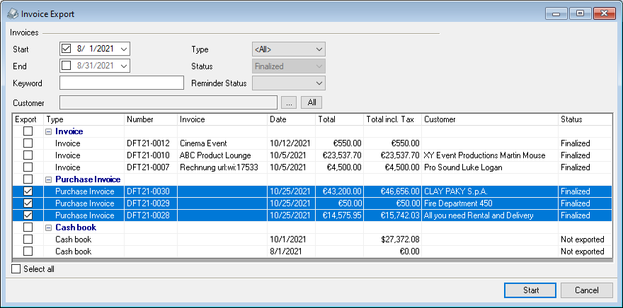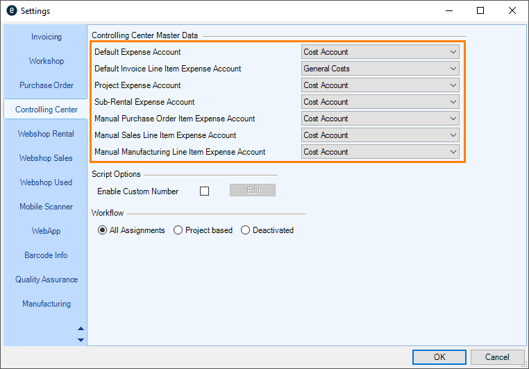 To make automatic account assignment possible when exporting data to the accounting department, the individual expense accounts can be pre-defined for the various easyjob program modules and areas. The predefined expense account is used automatically when assigning a purchase invoice.