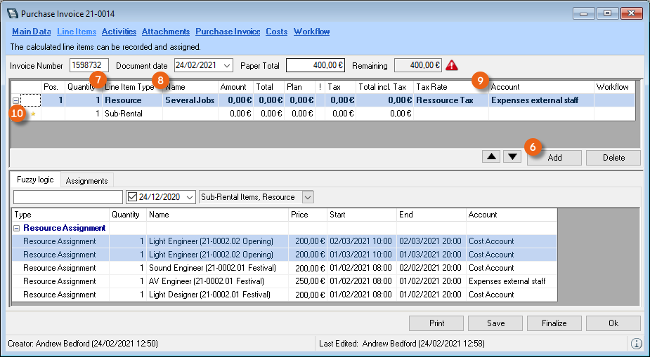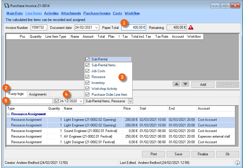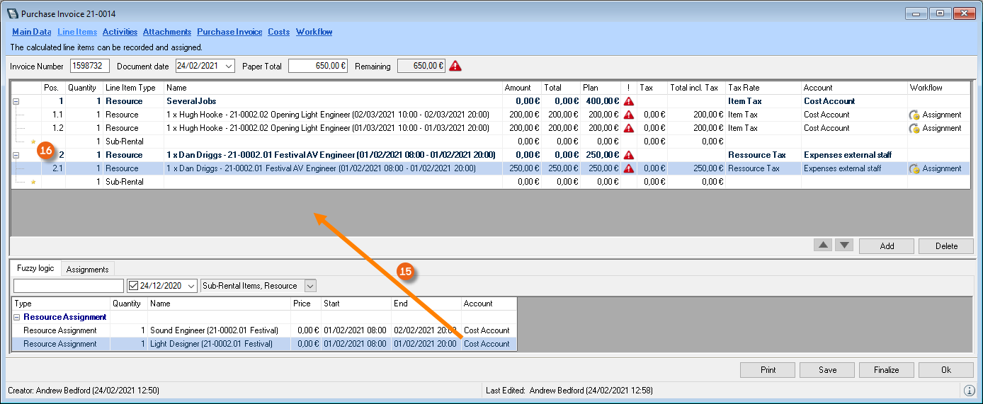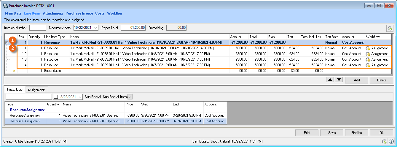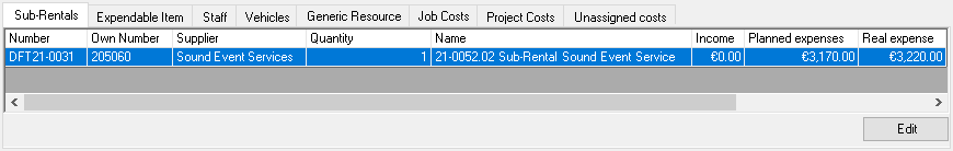 When assigning a purchase invoice to a sub-rental purchase order or a sub-rental job, the selected expense account is assigned.