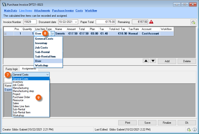 When creating a new purchase order line item, the line item type is pre-selected in the purchase invoice.