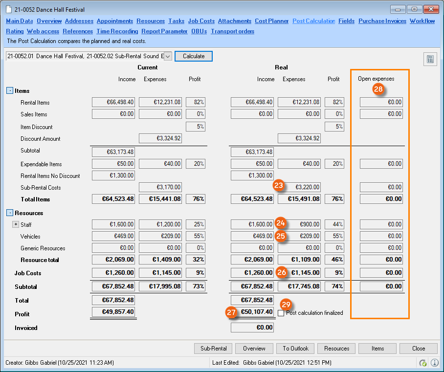 The Job differences overview is functionally identical to the invoice base. You can find more details in the easyjob manual Abrechnungsbasis.