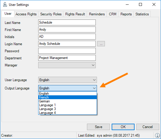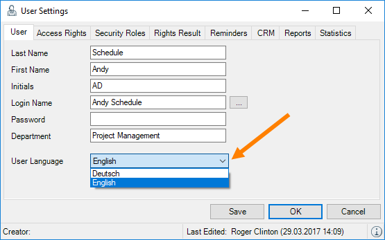 In the User Settings, you can set your User Language. This defines if you want your easyjob display in English or German. As soon as you carry out an English installation of easyjob 6, you can change the user language. Terms such as Project Status, Job Status etc. will be filled into your Reports (e.g. Proposal) with the (global) basic language and on the easyjob user interface based on the user language.