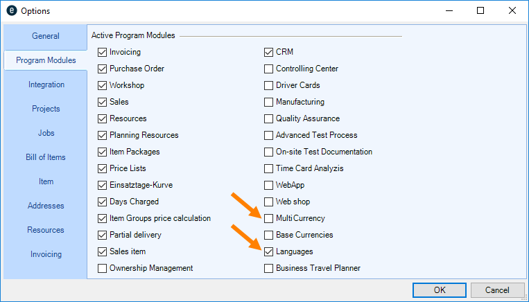 Go to the easyjob program settings to activate the Basic and Advanced easyjob International Pack modules. A separate installation is not required.