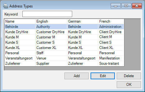 You can create almost all Master Data in multiple languages. To do so, select a function, such as Item Name or Address Type and enter the designation in the desired language.