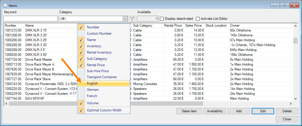 For some designations, such as Item names, you can display or hide the column for the language using the column heading context menu.