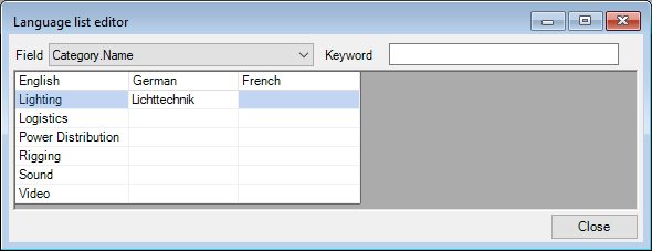 With the language list editor for the output language, you can access all terms of your master data as an overview and create them in multiple languages.