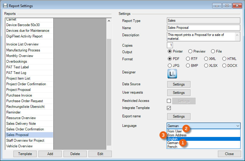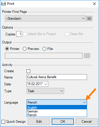 The terms that you have created in multiple languages in the Master Data can be used when printing or creating reports (e.g. proposals, delivery notes, packing lists, etc.). Therefore reports do not need to be created in every language. Before printing, you can select the output language in different positions.