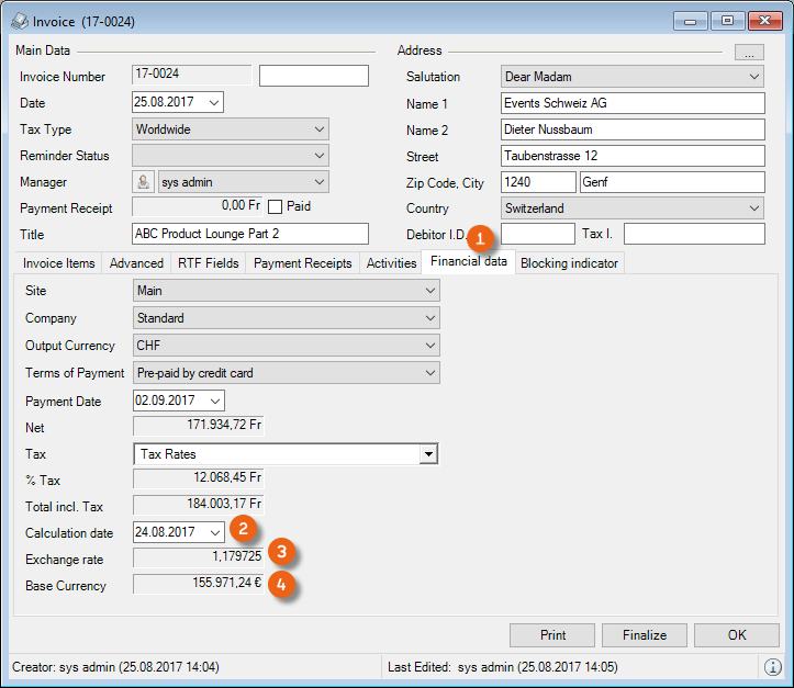 Create your Invoice as usual. The corresponding Line items are created in the selected currency. You can find details about the conversion rate on the Financial data tab. There you can see the calculation date used for the exchange rate . The real exchange rate is always used for the calculation. The currency is displayed in your base currency for comparison purposes .
