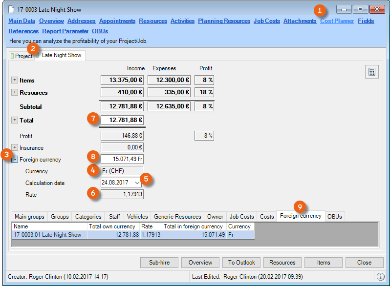 After you have scheduled your project as usual, you can view details about the foreign currency in the Cost Planner of a selected Job . The preset Foreign Currency will be displayed. The calculation exchange rate stored for the selected date is used for calculating the Total (Total in the base currency * calculation exchange rate ). The totals for the individual Jobs are also displayed in an overview .