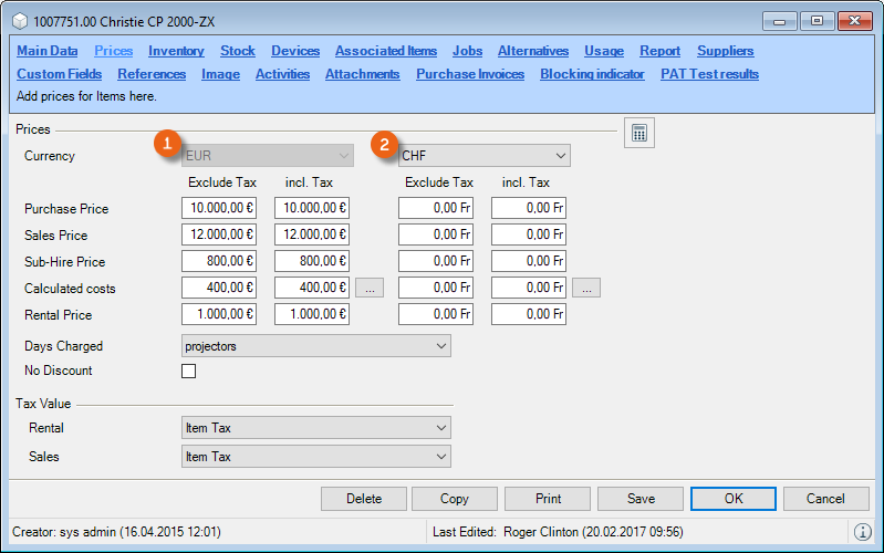 In the master data for your Items, you can create the prices in the base currency applicable for the respective site. The price information for the main site (e.g. in Euro) is displayed on the left side . On the right side , select the desired currency for your current site and enter the price.