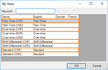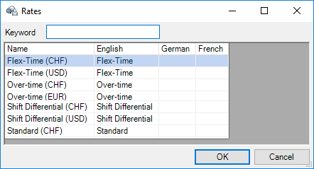 In the rate Master Sata, you can also create different prices. As soon as you have created a base currency, the staff rates are automatically duplicated and created in the corresponding currencies.