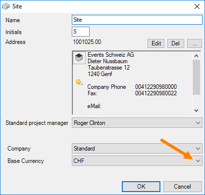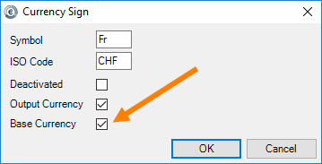 If your company has sites in various countries with different warehouses, you can enter your master data prices in the base currency of the respective country. To do so, first create the desired currencies. See Creating foreign currencies in the master data. Check the box for Base Currency if, for example in Switzerland, you want to make your calculation on the basis of the Swiss Franc.